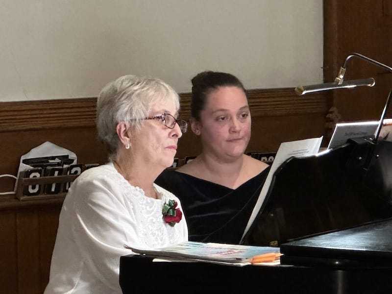 JEAN CHILDERS ON the piano with Hillary Knapp (right) turning pages.