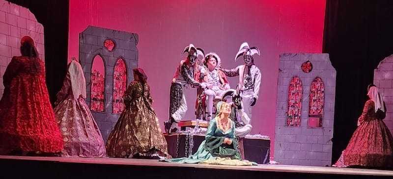 The script of “Queens” follows the historical record closely and calls for strong acting. The six queens rose to the challenge, dramatizing their respective fates: “divorced,” “died in childbirth,” “beheaded,” or—in the case of Henry’s last Queen—nearly beheaded, but “survived.” The six queens are played by Jordan Bertrand, Sophie Moore, Elyse Singh, Dani Polli, Kaylee Maloy, and Alyssa Raymond. Each of their dramatic scenes was superb, and their period costumes were fantastic. As Katherine Parr (Alyssa Raymond)—the one who survived—remarked, “you’ll say anything to keep your head.”