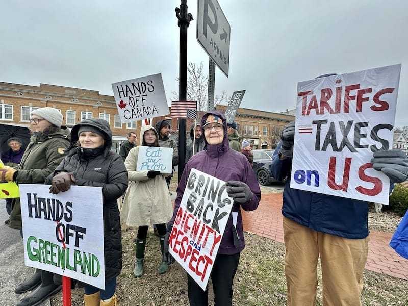 BRANDON—Despite a cold, blustery day, hundreds of people turned out for the local “Hands Off” protest along Route 7 in downtown Brandon on Saturday afternoon. The protest was organized by Indivisible Brandon, a nonpartisan local chapter of a national organization that was founded in response to President Trump’s first term. Many such rallies were held around the country on Saturday.